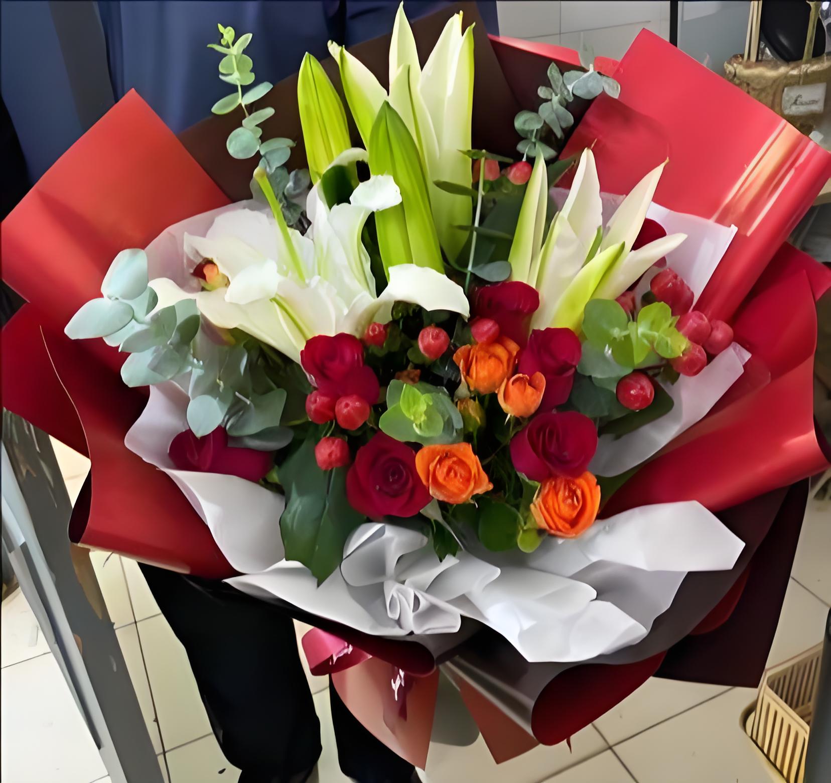 咸阳泾阳县花店包11枝红玫瑰、2枝多头白百合、6枝橙色多头玫瑰、红豆、尤加利叶